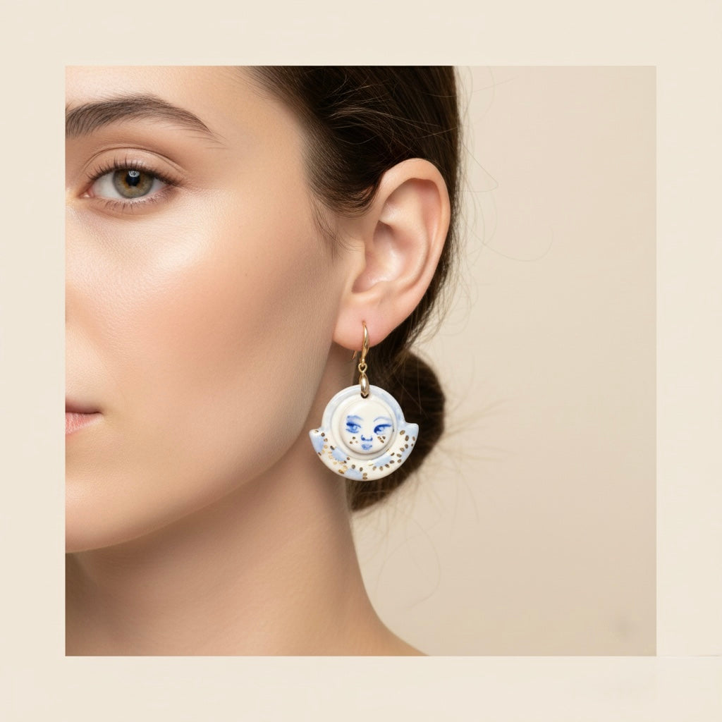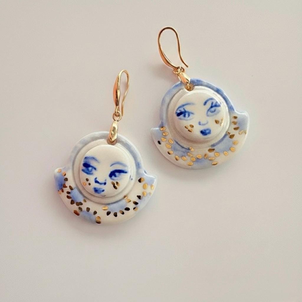 Delft Blue Sun Face Earrings | Hand-Painted Porcelain with 22K Gold | Artisan Jewelry