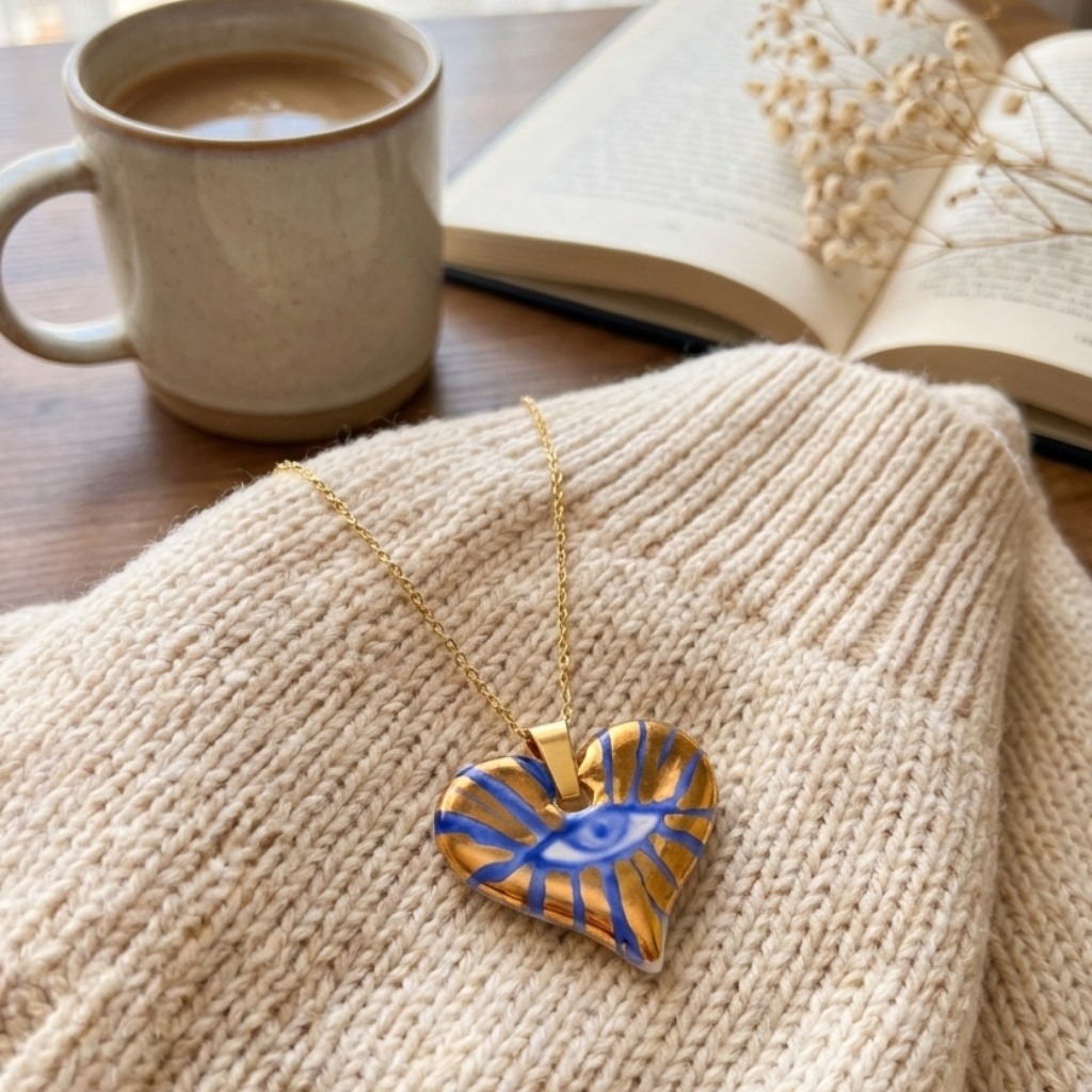 The eye has watched over us for centuries. This hand-painted porcelain pendant carries that ancient symbolism into something you can wear every day — a talisman reimagined in Delft blue and real 22K gold lustre, kiln-fired and made to last.