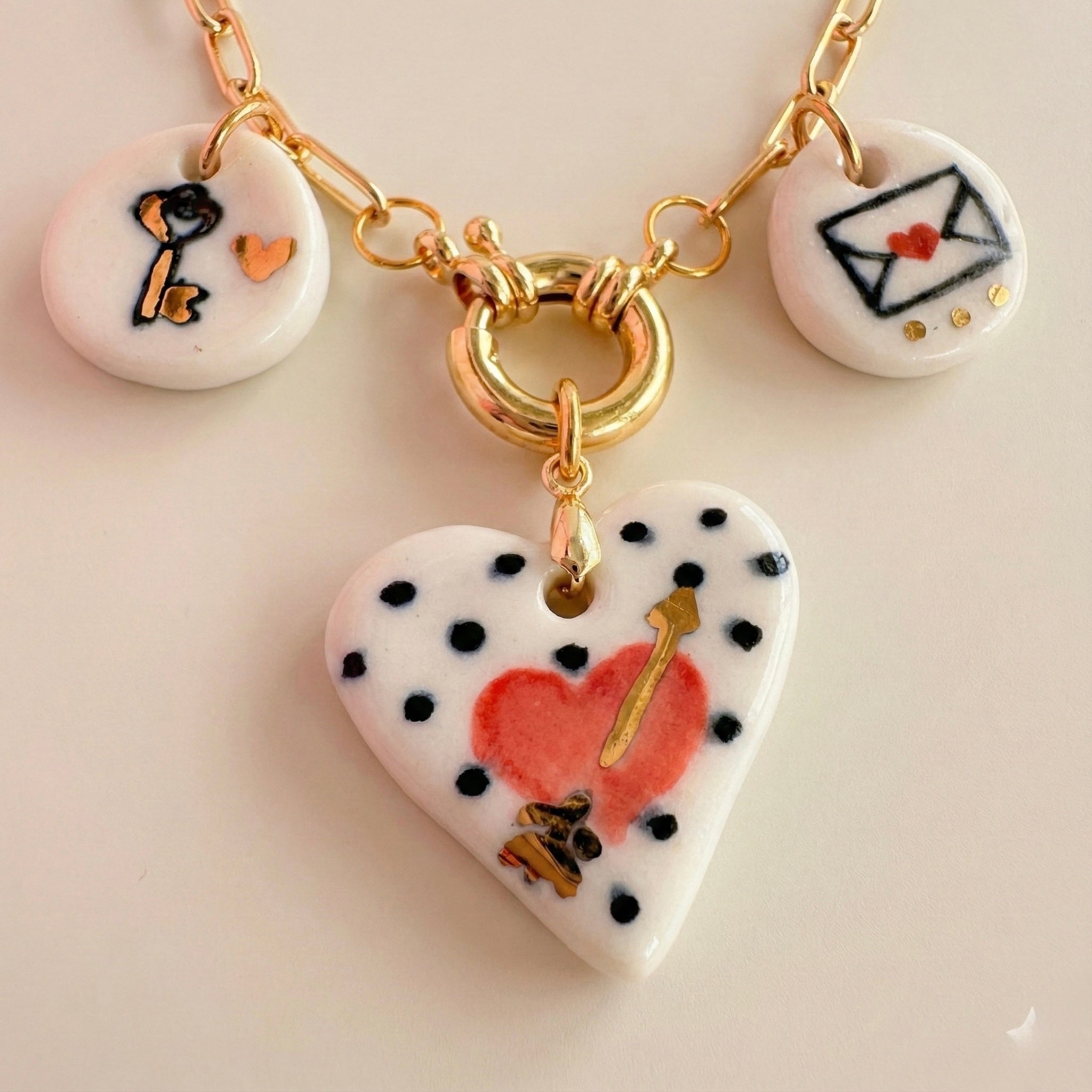 Cupid’s Arrow Polka Dot Heart Necklace | Hand Painted Ceramic Charms | 14k Gold 16" Paperclip Chain | Love Letter & Key Jewelry