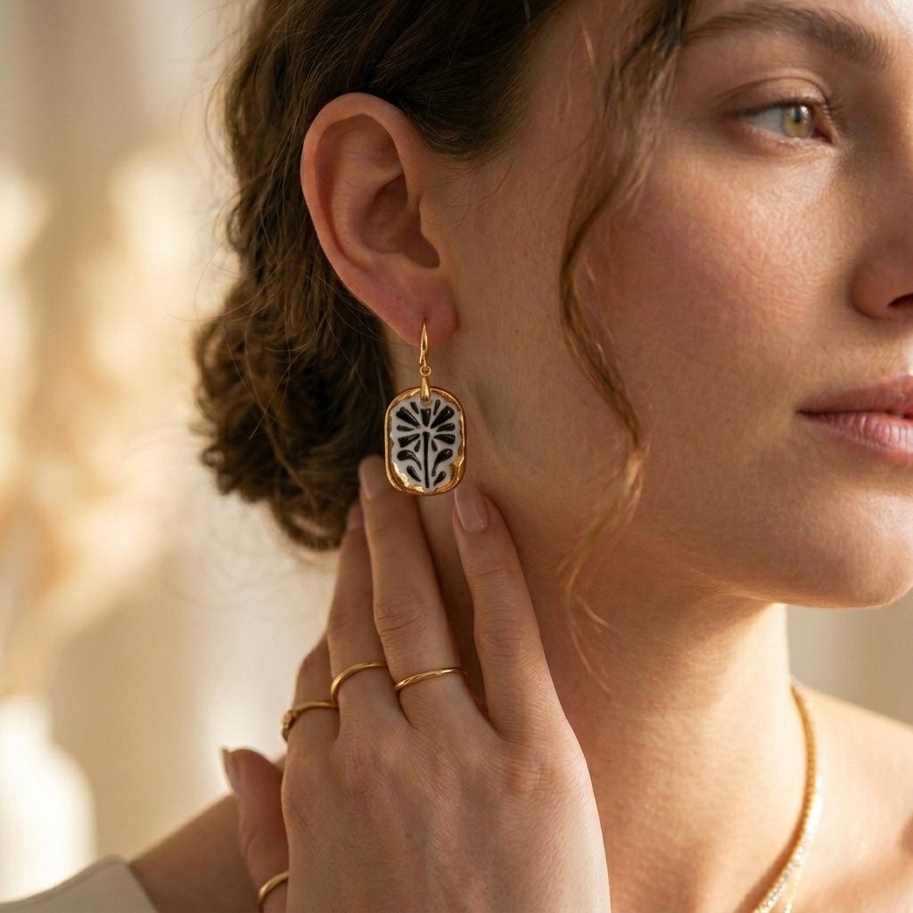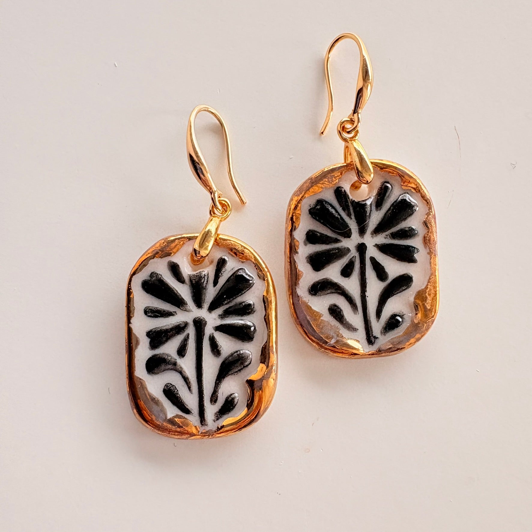 These handcrafted porcelain earrings feature a bold botanical relief design in deep black, contrasted with a luminous 22K gold edge.