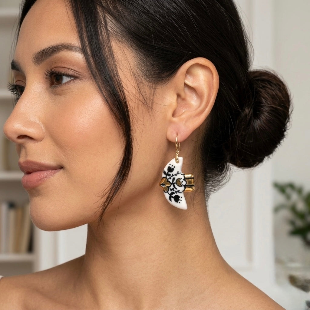 Porcelain bird dangle earrings inspired by folk art traditions, hand-painted and finished with a luminous 22K gold lustre. Triple-fired at 1200°C for lasting brilliance – each pair is a one-of-a-kind piece of wearable Canadian craft.