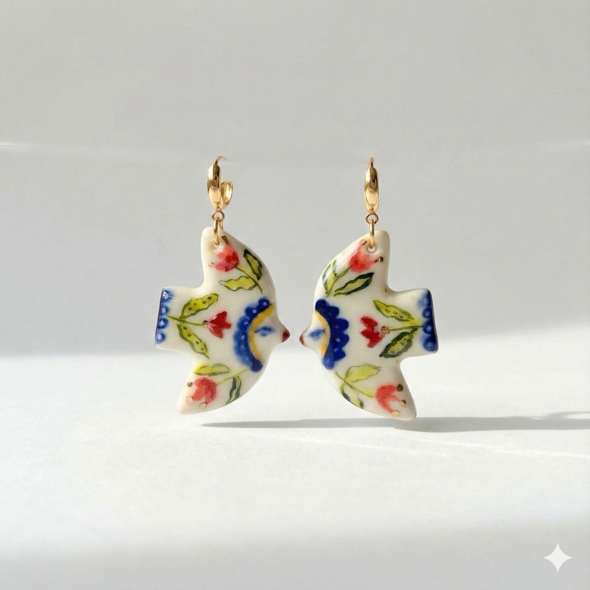 Elevate your accessory collection today with these stunning Porcelain Bird Earrings with hand-painted floral Designs. They are not just an accessory, but a beautiful expression of art and culture that you can wear with pride.